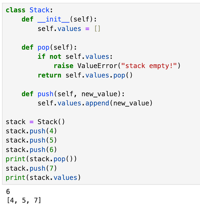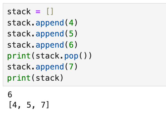 Alternatively, we can simply use a list itself without having to implement an entirely new Stack class (we often do this to save time during interviews). Here, .append is the same as .push