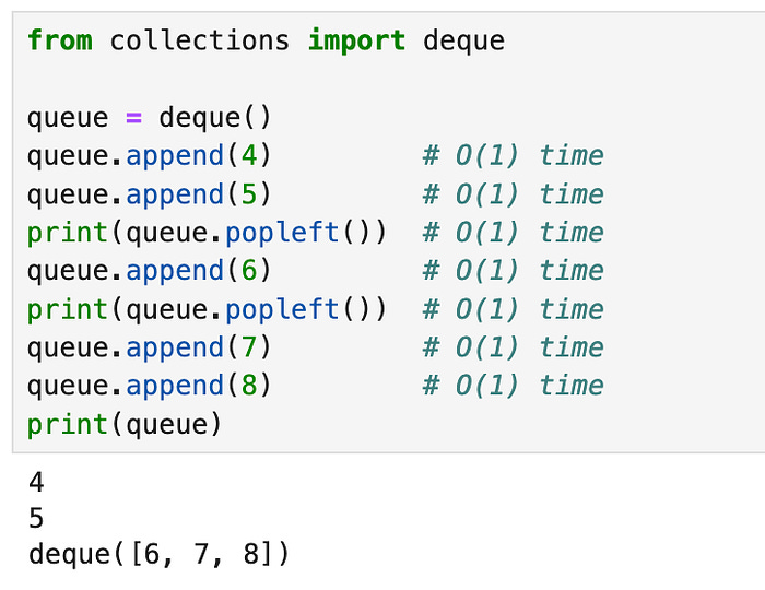 In a deque, popping from and appending to both left and right sides of the queue takes O(1) time. Always use a deque instead of a regular list to implement a queue.