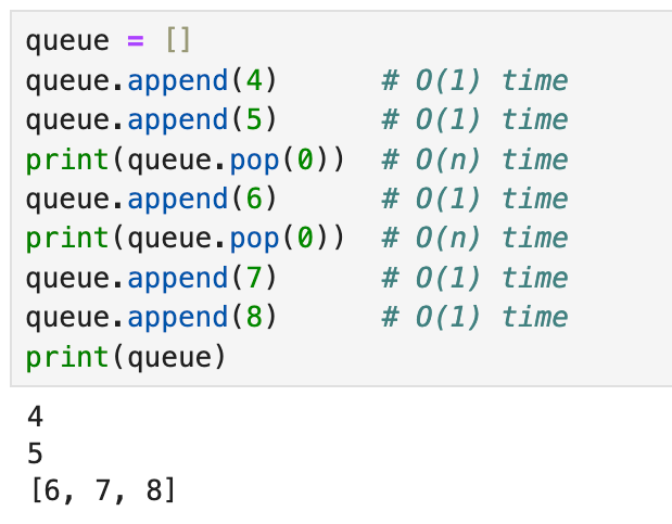 Unlike a stack, it isn’t a good idea to use a regular Python list to implement it — we technically can, but it’s inefficient and your interviewer will probably question you for doing so.