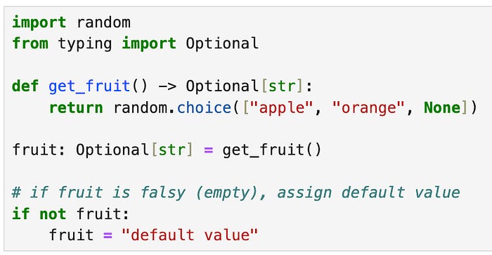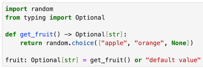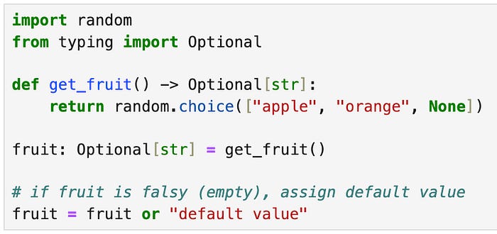 if fruit is falsy (empty string or None), it is automatically reassigned to "default value"