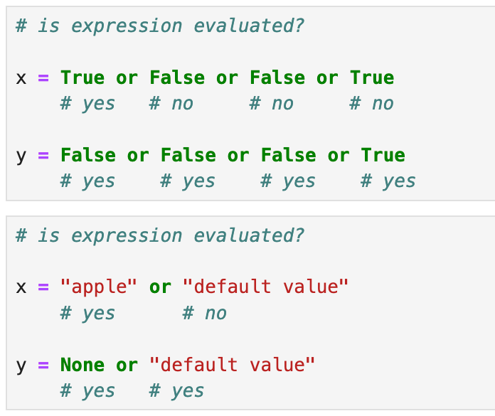In Python, and and or are short-circuit operations. This means that they evaluate stuff only as much as they have to. Visualization: